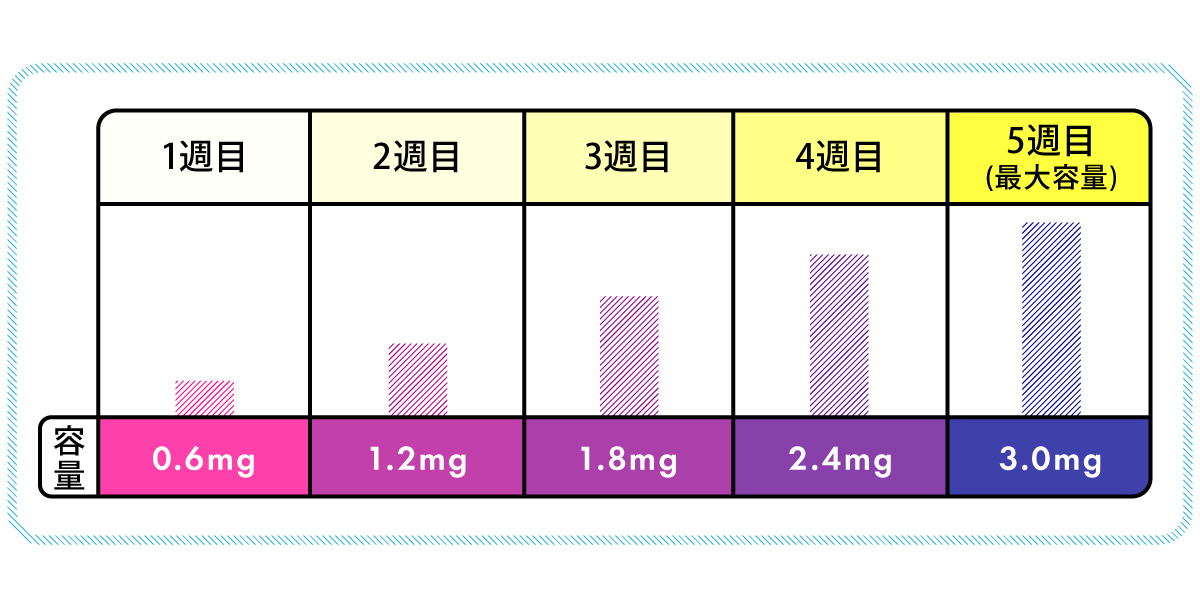 開始用量は1日あたり0.6mgです。その後、1週間ごとに0.6mgずつ増量し、5週目には最大で1日3.0mgまで増量します。量は注射針の目盛りで合わせます。