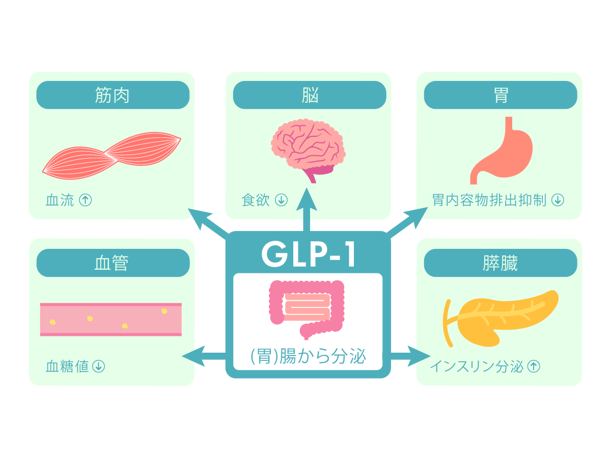 GLP-1はやせるホルモンの一種で、食事に含まれるブドウ糖やタンパク質、脂肪など様々な栄養素から刺激を受け、小腸から分泌されます。