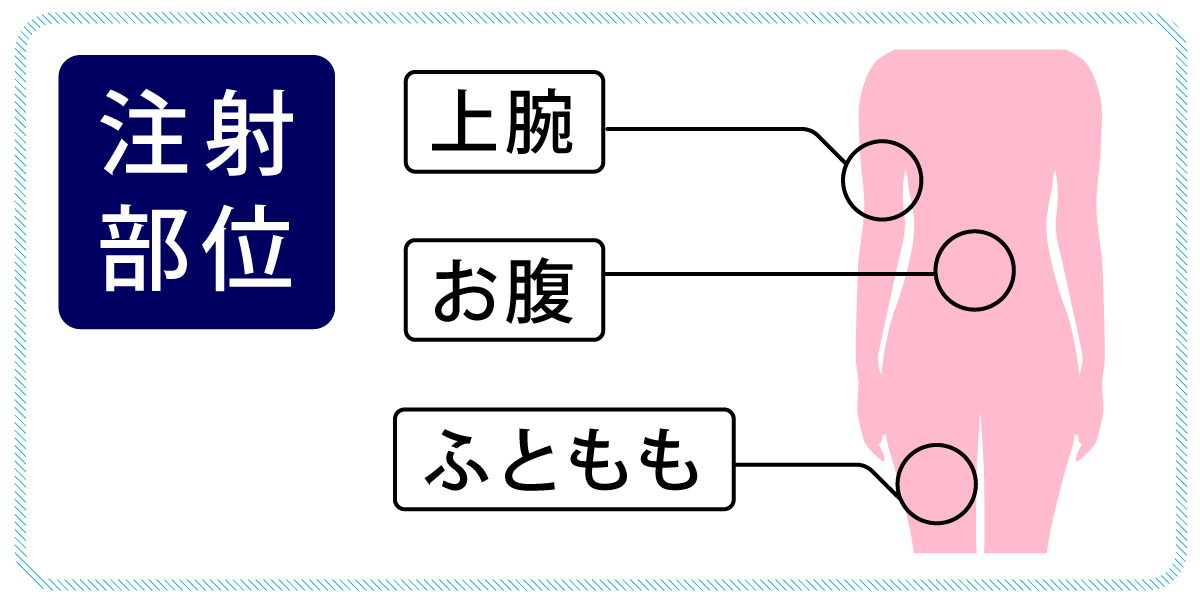 注射する時間は食事と関係なく、何時でも大丈夫です。注射をする部位はお腹や太もも、上腕の皮下です。針の太さはわずか約0.18mmで、これは髪の毛約2本分なので痛みは少ないです。