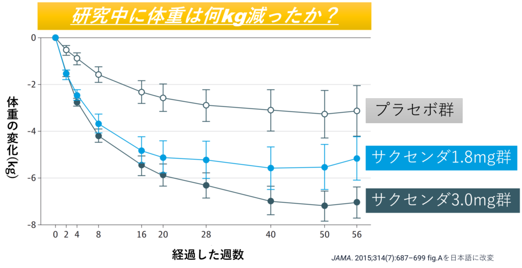 この研究は2011年から2013年にかけて9か国の826人に対して行われました。参加者のうち423人をサクセンダ3.0mg投与群、211人をサクセンダ1.8mg投与群、212人をプラセボ(偽薬:比較するための何も効果がない薬)投与群に分けて56週間観察しました。すべての参加者は通常の食事より500kcal減らした食事と一週間あたり150分のウォーキングも合わせて行いました。