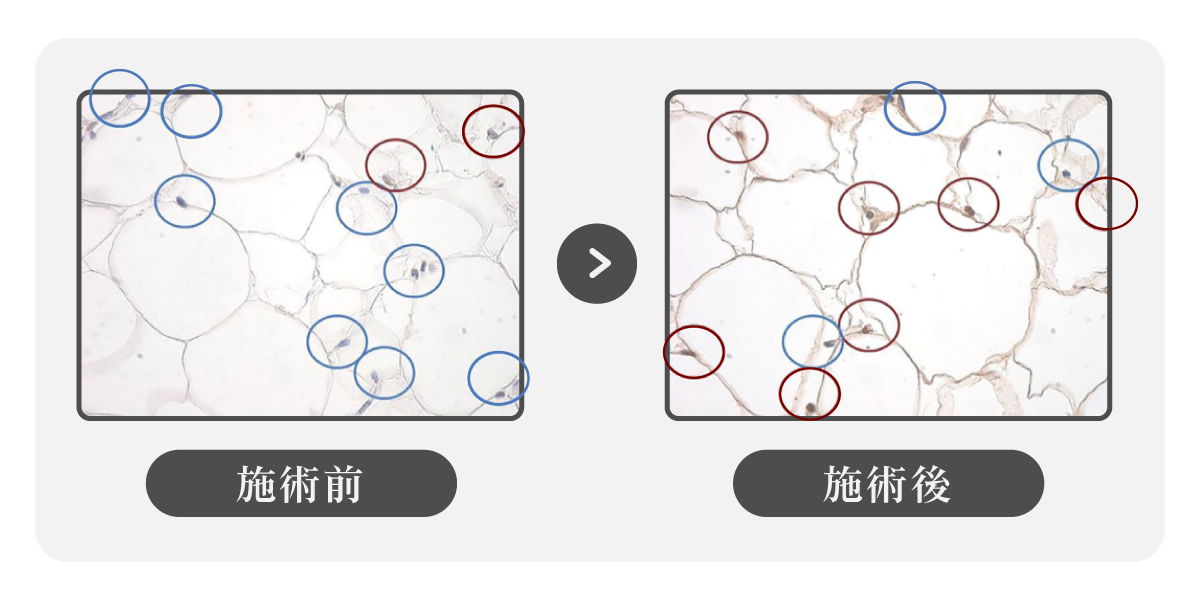 青丸が生きている脂肪細胞の核を示しており、赤丸が死んだ脂肪細胞の核を表しています。医療EMSにより脂肪細胞が破壊されていることを表しています。