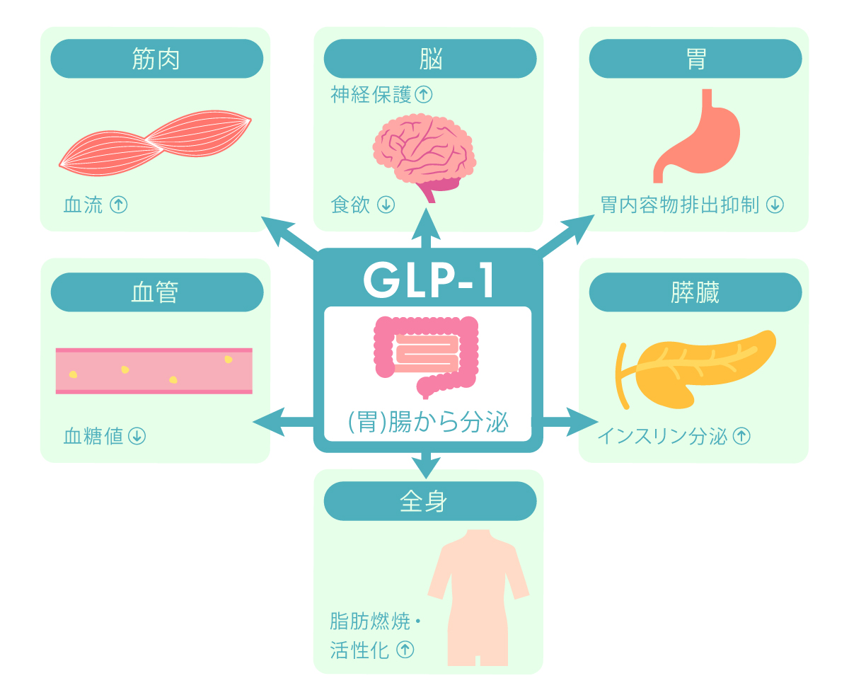 GLP-1(グルカゴン様ペプチド1)はもともと私たちの体に備わっていて、食事をとった際に含まれるブドウ糖やタンパク質、脂肪など様々な栄養素から刺激を受けとり、小腸から分泌されます。
