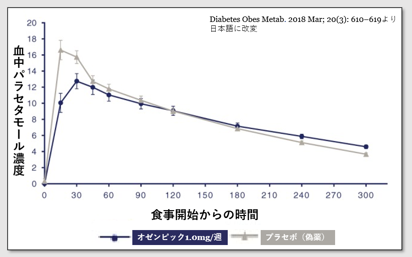 オゼンピックを投与している群では食事開始から1時間までの間で血中の「パラセタモール」濃度が下がっていて、胃の「蠕動運動」が抑制されているのがわかりますね。