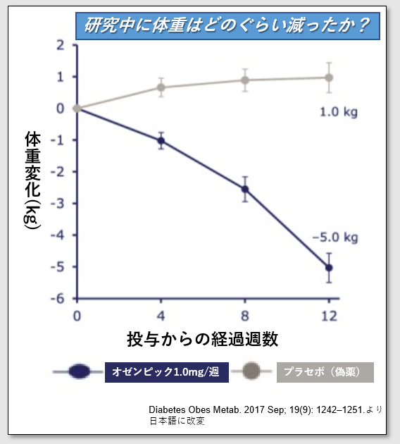 この研究は糖尿病ではないBMI30-45の肥満の30人の参加者をオゼンピック投与群15人とプラセボ(偽薬)投与群15人に分けて3ヶ月間(12週間)観察したものです。参加者の平均体重は101kgとかなり肥満でした。