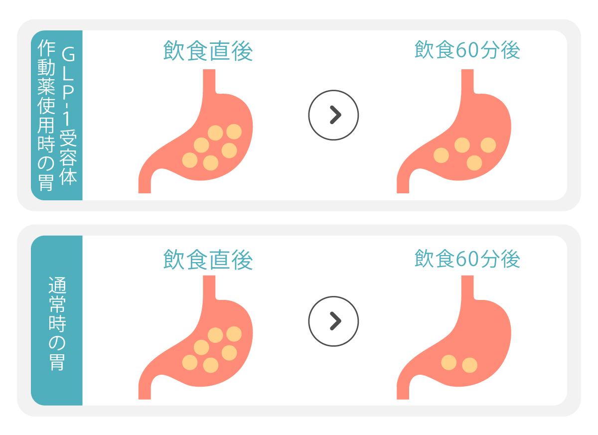 GLP-1受容体作動薬はこの胃の「蠕動運動」を抑制し、食べ物をゆっくり吸収させることで、胃の中に食べ物が残っている時間を長引かせます。そのことで少ない食事量でも満腹感をもたらします。
