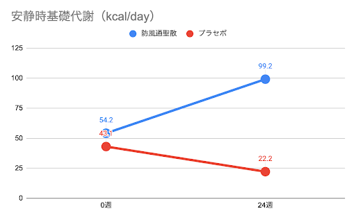 防風通聖散を使用した群ではプラセボ群に比べて体重、体脂肪率、内臓脂肪が優位に減少し、安静時基礎代謝が上昇しました。