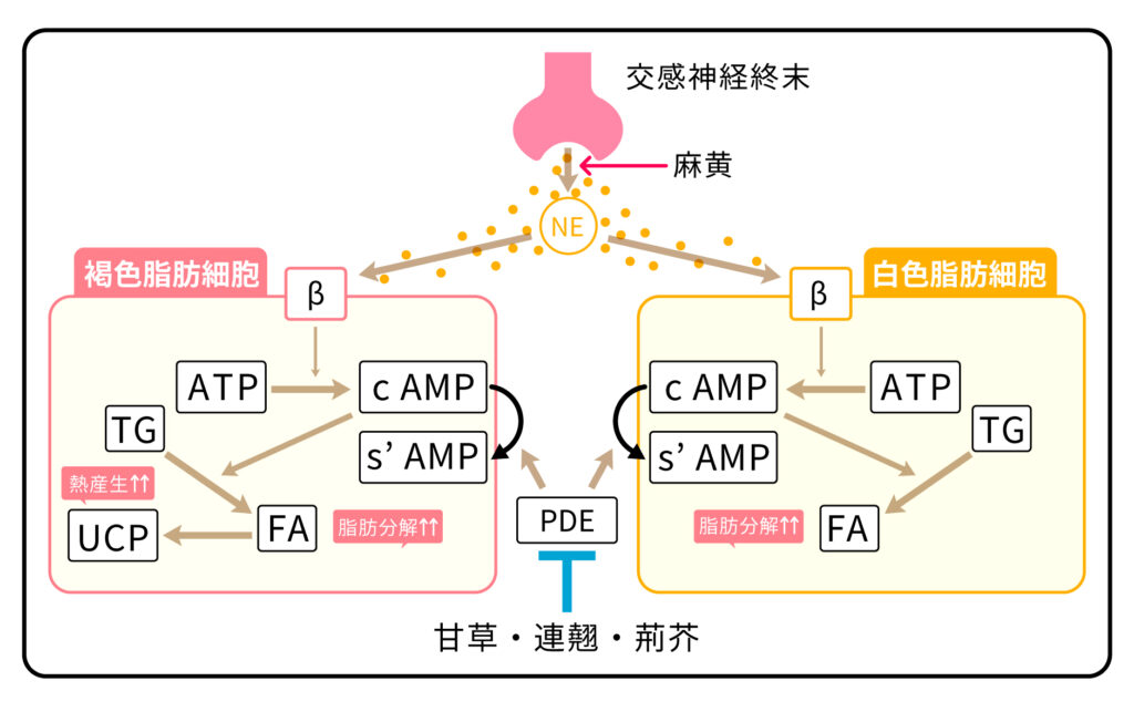 NE が白色脂肪細胞、褐色脂肪細胞のアドレナリン受容体(β)に結合すると、脂肪分解や cAMP の活性化を介した熱産生が生じます。