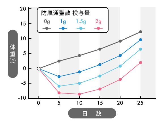 初めの6日で防風通聖散を投与されたマウスは体重減少が見られており、さらに防風通聖散の量が増えるほど体重が減少しているという結果になりました。