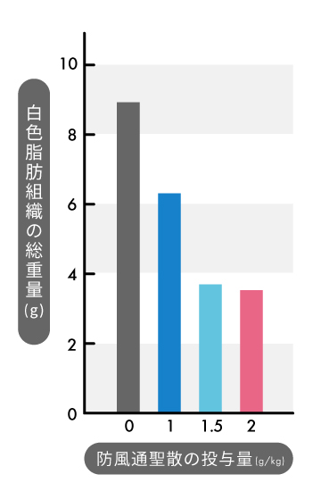 こちらは25日後のマウスの白色脂肪細胞の重さを比較したグラフです。左の防風通聖散を投与してないマウス(一番左のグラフ)に比べて、防風通聖散を投与したマウスは明らかに脂肪の量が減少しているのがわかります。