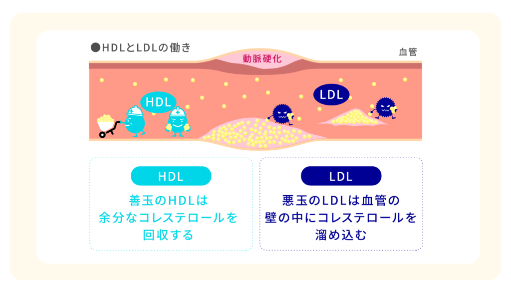 LDLコレステロールはコレステロールを体内に溜め込む役、HDLコレステロールは体内からコレステロールを回収する役を担っています。