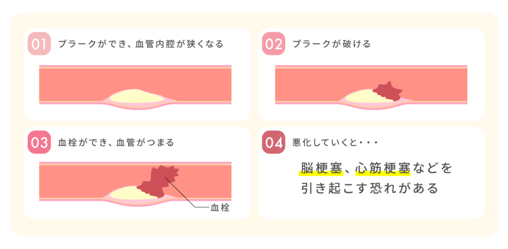 体内のコレステロールの量は、LDLによる供給とHDLによる回収のバランスで成り立っています。しかし、食事や体質などによって、LDLコレステロールが増えすぎたり、余分なコレステロールを回収するHDLコレステロールが少なすぎたりすると、コレステロールのバランスが崩れ、血管内にコレステロールが蓄積して、動脈硬化や血管の内側を狭める(プラーク形成)原因となります。