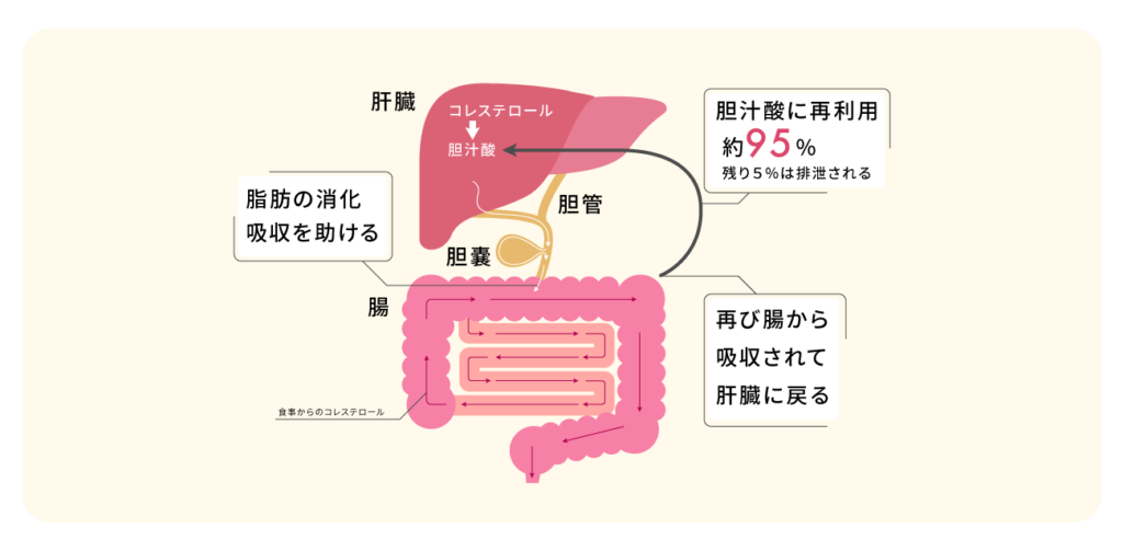 消化管に排出された胆汁酸は食事由来のコレステロールの吸収を助けます。その後、消化管に排出された胆汁酸のほとんど(95%ほど)が消化管で再吸収され肝臓に戻ります。この一連のサイクルを胆汁酸の腸肝循環と呼びます。