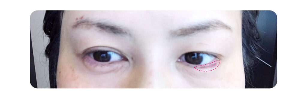 画像右側の目に、昨日は確認できなかった内出血ができていました。私の場合は1日置いて内出血が出ましたが、人によっては翌日に出てくるようです。内出血による痛み、痒みはありません。