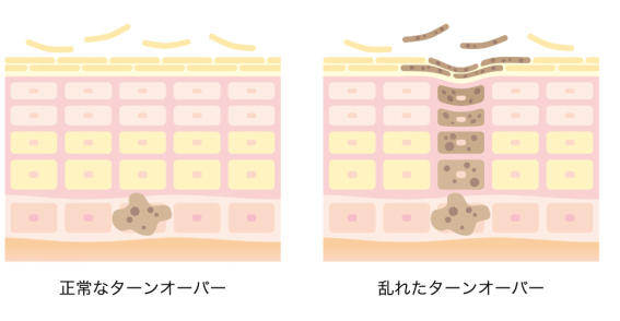 角栓は、ターンオーバーの乱れによって作られます。ターンオーバーの原因として、不規則な睡眠、食生活、紫外線、皮膚のバリア機能の低下、皮脂の過剰分泌、ホルモンバランスなどが挙げられます。ターンオーバーが乱れることで作られます。バリア機能が低下し、角層が水分不足・乾燥状態になると皮膚はターンオーバーの速度を挙げて角層細胞を猛スピードで作ります。「ターンオーバーが速いのは良さそう」と思うかもしれませんが、実は速すぎるのも良くありません。
