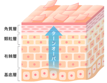 正常な肌のターンオーバーは、表皮の一番底にある基底層にある作られた「ケラチノサイト」という細胞が形を変えながら新しい細胞になっていきます。下から少しずつ押し上げられ古くなった角質細胞が最後は垢になって剥がれ落ちるというサイクルです。ターンオーバーが行われる過程には、大まかに言うと下記の2段階があります。