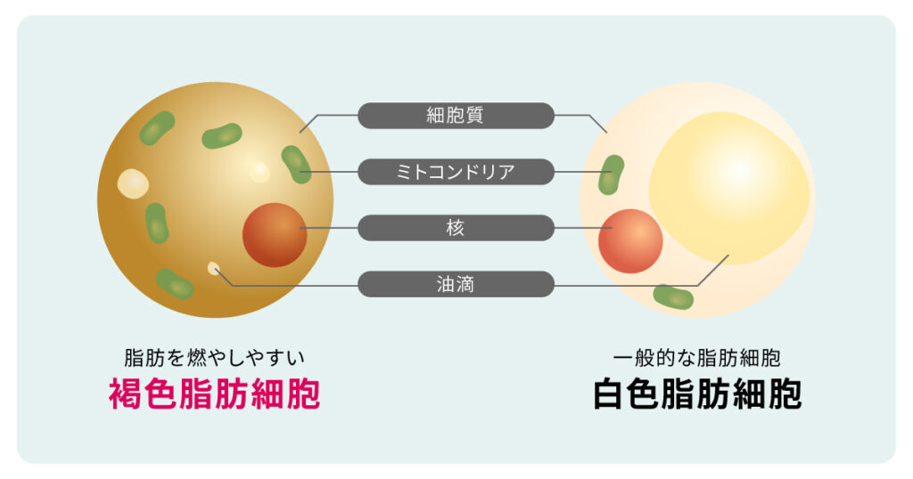 脂肪組織の中には褐色脂肪細胞と呼ばれる細胞があり、寒冷刺激時に、体温、エネルギー消費、体脂肪を調節しています。