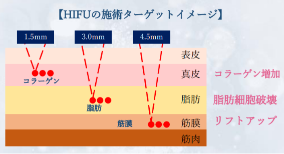 ハイフは①表皮・真皮(コラーゲン層)、②脂肪層③筋膜に照射することが可能です。それぞれの層にどのような作用が起こるのでしょうか。