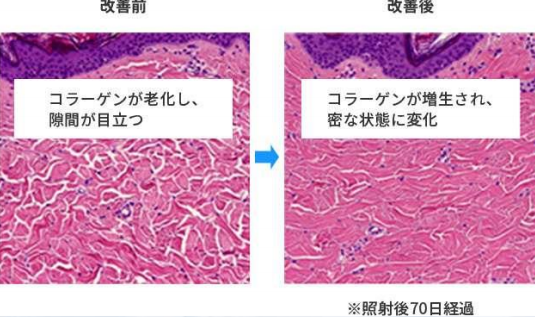 ハイフで真皮上層に照射すると、傷ついた肌が自らよみがえろうとする「創傷治癒機能」が働き、コラーゲンの生成が促進され、肌のハリ・ツヤが期待できます。