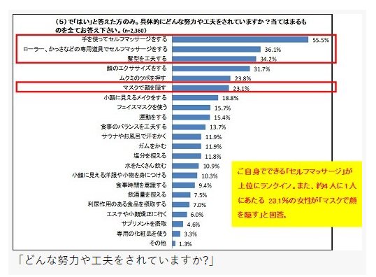 2015年にユニ・チャームが、10代~50代の女性5,928名を対象に行った「小顔」に関する意識調査では、「今よりも小顔に見せたいか」の質問に対して、85.4%が「はい」と回答しており、8割が「小顔願望がある」ということが分かりました。工夫をしている人はおよそ4割で、下記のような工夫をしていると答えました。